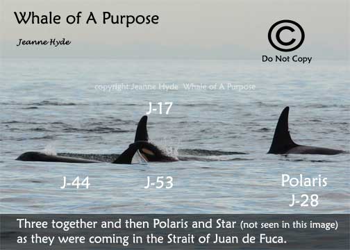 ...when inbound it was five whales: J-17, J-44, baby J-53, J-28, and J-46...the other two family members, Tahlequah J-35 and her boy, Notch J-47 were not with them...